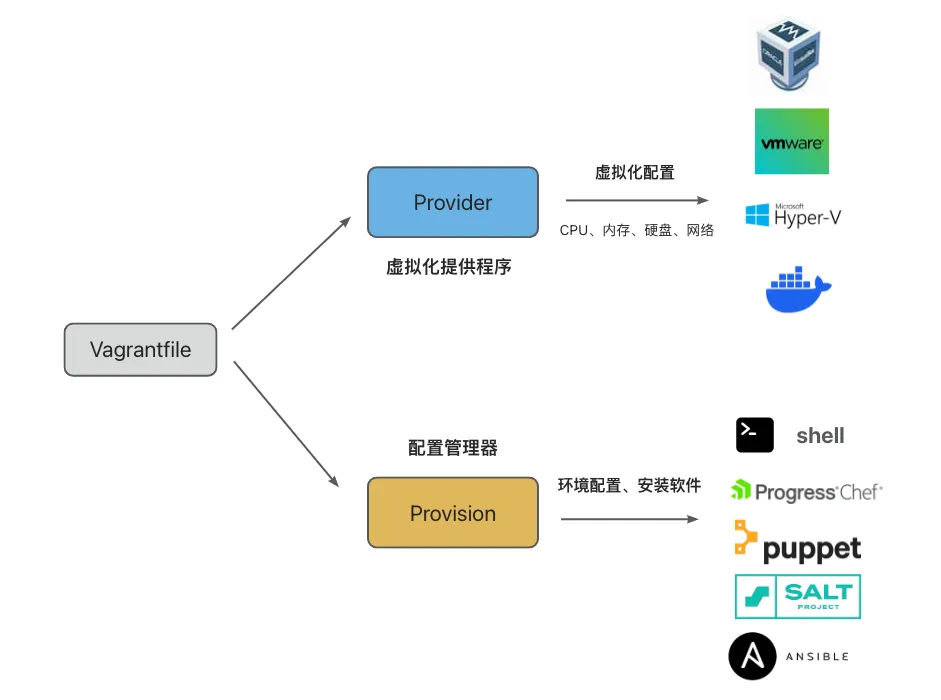 Vagrantfile 主要用来配置 Provider(虚拟化提供者) 和 Provision(配置管理器)